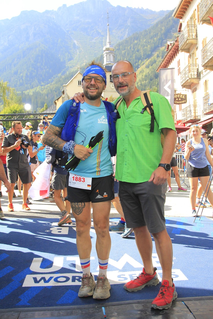 Eine Absperrung hier, ein Hinweisschild dort. Er schaute auf den Boden vor sich und kann noch nicht wirklich fassen, was im hier und Jetzt geschieht. Plötzlich sind überall Menschen Sie schreien seinen Namen, treiben Ihn an „ Alez…Alez…Frank“. Die Leute in den Cafés applaudieren. Das ist Chamonix live. Hier wird jeder Läufer, wie der erste Läufer empfangen. Noch 400 Meter, plötzlich taucht Peter aus der Menge auf, zückt das Handy und läuft die letzten Meter mit. Noch zweimal rechts und einmal links abbiegen und dann ist der Zielbogen vor Ihm. Er ruft noch einmal alle Reserven ab und reißt die Arme nach oben und dann ist es endlich geschafft.