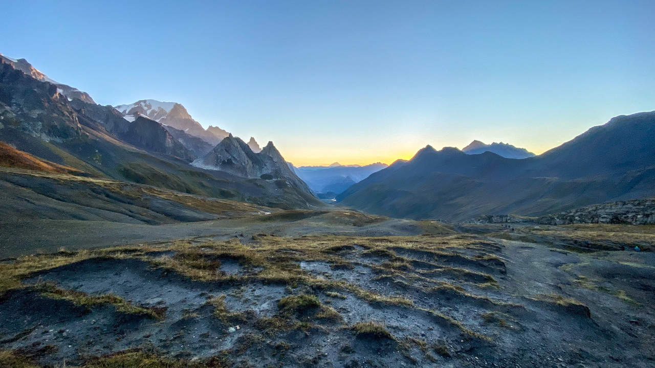 Der VP Les Chapieux wurde gegen 04:00 Uhr passiert. Das Feld hatte sich dort schon etwas auseinander gezogen. Mit dem Col de la Seigne auf 2.500 Metern über dem Meer wartete der nächste Pass auf die Ultraläufer und zum Sonnenaufgang waren auch diese Höhenmeter geschafft. Jetzt stand ein etwas technischer Abschnitt bevor, der teilweise über verblocktes Gelände führte hinab zum Lac Combal. Die Sonne schob sich langsam hinter der Silhouette des MontBlanc hervor und ließ die Bergwelt erwachen. Die folgenden 15 Kilometer bis Courmayeur auf der italienischen Seite verliefen größtenteils bergab. Die letzten 3,8 Kilometer in den Ort führten brutal steil nach unten in den Ort. Auf diesen 3,8 Kilometern musste ein Höhenunterschied von -1210 Höhenmeter downhill gelaufen werden. Bei der Ankunft in Courmayeur wartete Peter Stubbe auf Frank. In diesem Rennen dürfen die Läufer an sechs festgelegten VP´s Support erhalten. Peter versorgte Frank mit allem, was er zu diesem Zeitpunkt benötigte. Da die Oberschenkel nach 81 Kilometer und 4.600 Höhenmetern schon ziemlich mitgenommen waren, wurden sie kurzerhand mit einer Rolle massiert. Nach einer 30 minütigen Pause ging es für Frank weiter. Die Läufer befanden sich jetzt auf der anderen Seite das MontBlanc Massiv. Die folgenden 15 Kilometer bis zum VP in Arnouvaz liefen für Frank nicht so gut. Bei dem Aufstieg zum Refuge Bertone zerbrach einer der Trail-Stöcke. und dieser Umstand führte dazu, dass er für diesen Abschnitt viel länger gebraucht hatte als geplant. Jede dieser Stationen, die von den Teilnehmern passiert wird, hat eine feste Cut-Off-Zeit, was bedeutet, dass ein Läufer aus dem Rennen genommen wird, sobald zu er zu spät ankommt. Frank hatte eigentlich immer ein Zeitpolster von 45-60 Minuten, das er bedingt durch die Streckenführung am Ende noch ausbauen wollte, doch nun lief ihm auf einen Schlag die Zeit davon. Ein Blick auf die Uhr sagte Frank, dass er nur noch 16 Minuten Zeit hatte, aber Arnouvaz liegt unten im Tal. Der Pfad wand sich über viele Serpentinen hinab. Zweifel kamen auf. Ist die Strecke in der vorgegebenen Zeit noch zu schaffen? Das wird nichts, ging ihm durch den Kopf. Frank konnte den Sprecher aus dem Tal hören, wie er die noch verbleibenden 8 Minuten ansagte. Es sah nicht danach aus, dass die Zeit reichen würde! Vielleicht noch 10 Kehren, vielleicht noch 9. Die Zeit lief Ihm davon. Um 18:15 Uhr würde dort der Cut-off sein. Ein weiterer Blick auf die Uhr und die Erkenntnis, dass es eigentlich unmöglich ist, waren in diesem Moment nicht der größte Motivator.